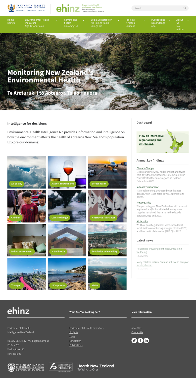 EHINZ monitors and reports on how the environment affects the health of the NZ human and animal populations. I worked with EHINZ to redevelop their site.